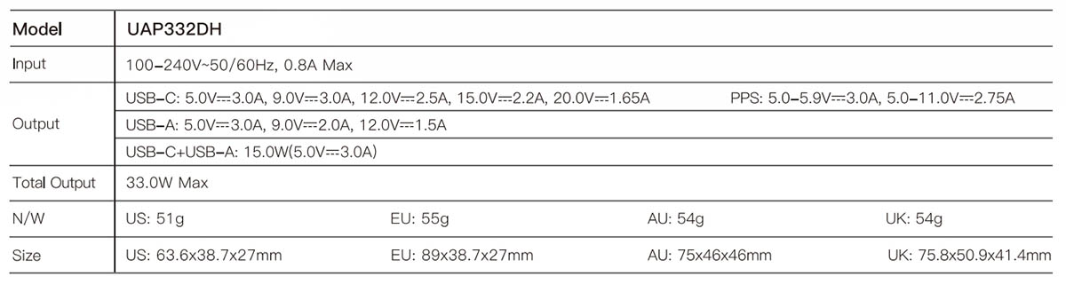 UAP332DH/UAP331DH 33W Wall Charger 33W PO fast chargerDual output portsCompact designIdeal for iPhone & iPad